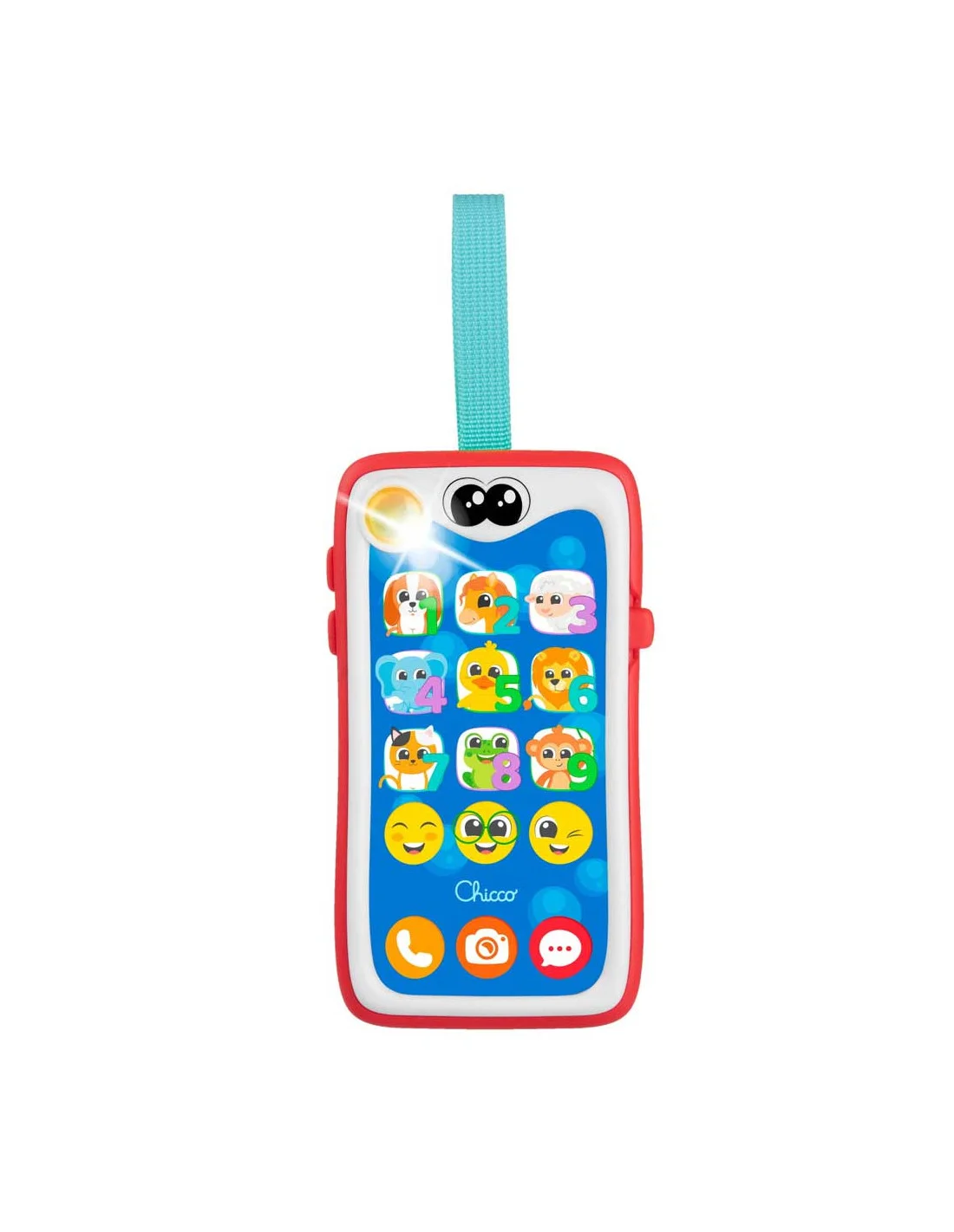 - Allume le jouet en sélectionnant le volume et appuie sur l'un des 15 boutons pour activer les lumières et les sons et pour écouter les bruits d'animaux, les sonneries, les notifications et pour faire semblant de prendre des photos !