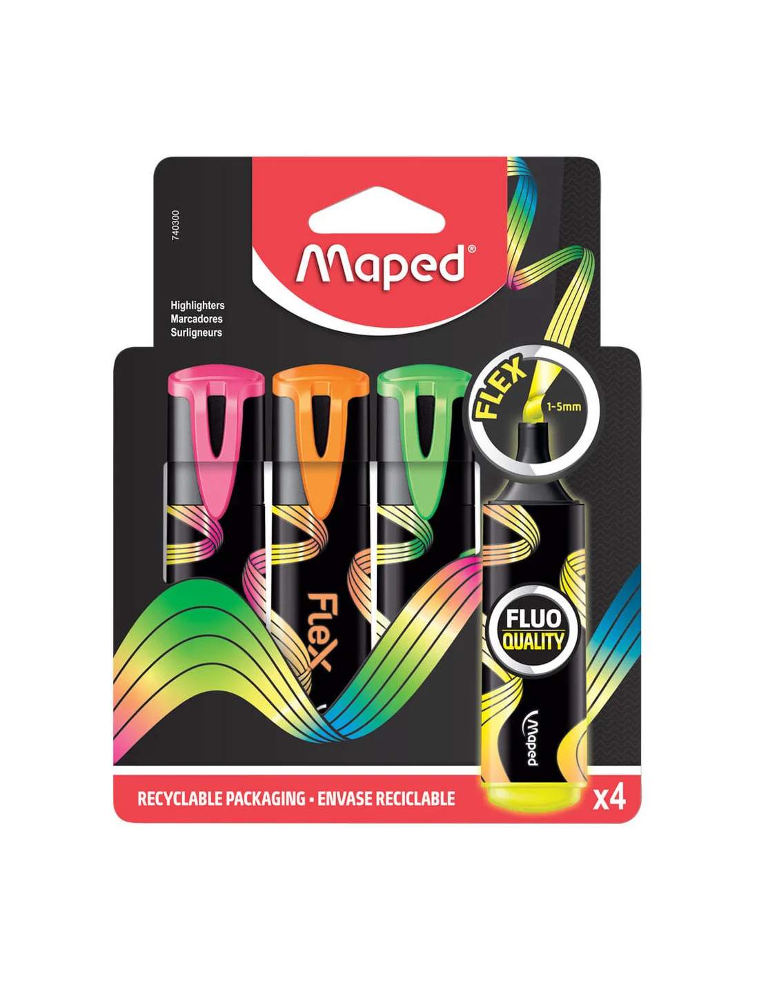 Emballage recyclable : les surligneurs Maped Flex sont dans une pochette carton 100% recyclable.
