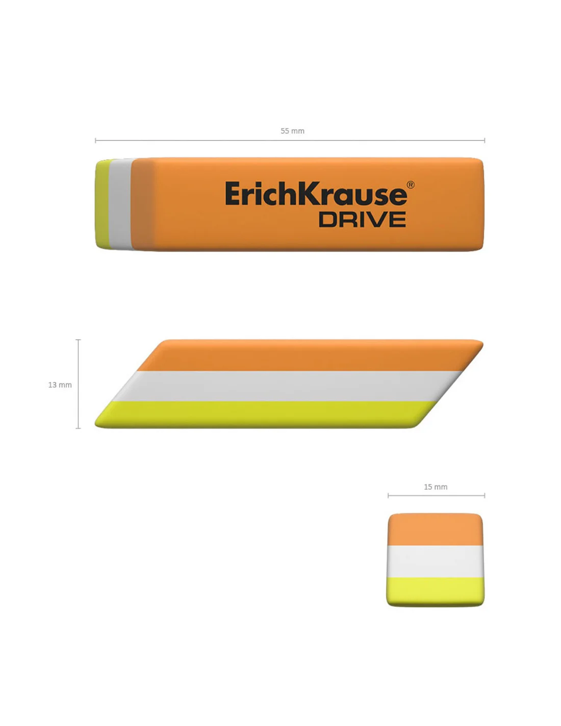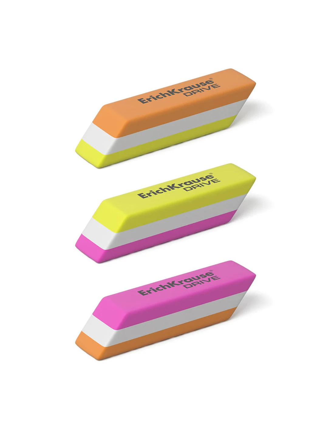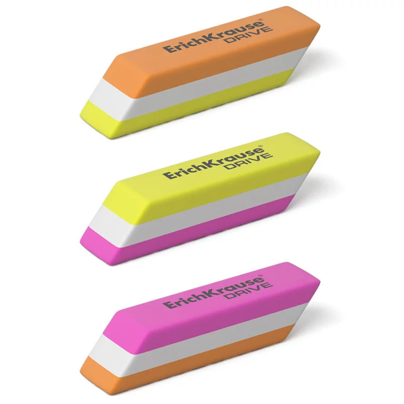 Une gomme douce de forme classique en caoutchouc thermoplastique (TPR) moderne, écologique et hypoallergénique. Présenté dans un design de couleur à trois couches. Sans poussière. La composition chimique de la gomme ne contient pas de PVC !