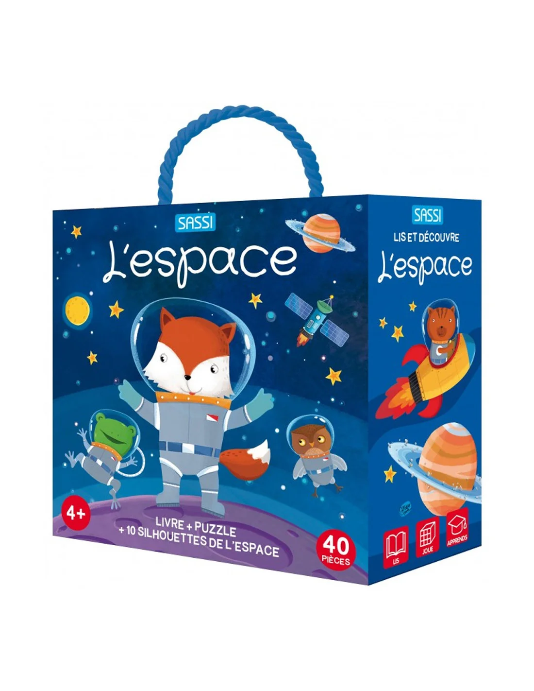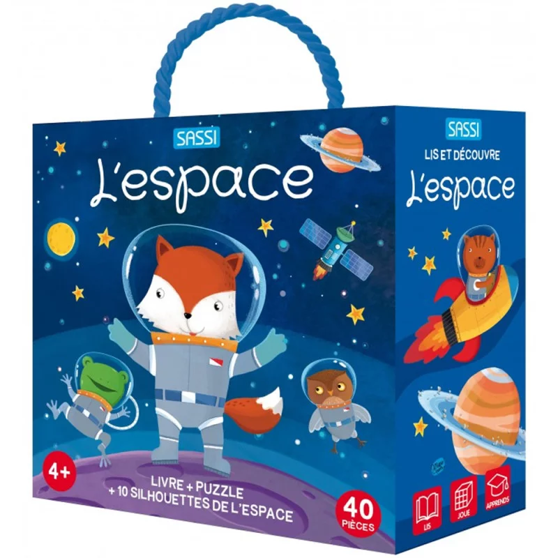 Q-box, L'espace une boîte enrichie de détails iridescents contenant un livre de 10 pages, un puzzle de 40 pièces et 10 silhouettes de l’espace à assembler et à placer sur le puzzle, pour apprendre à econnaître les couleurs, les formes, les chiffres et à associer les mots !