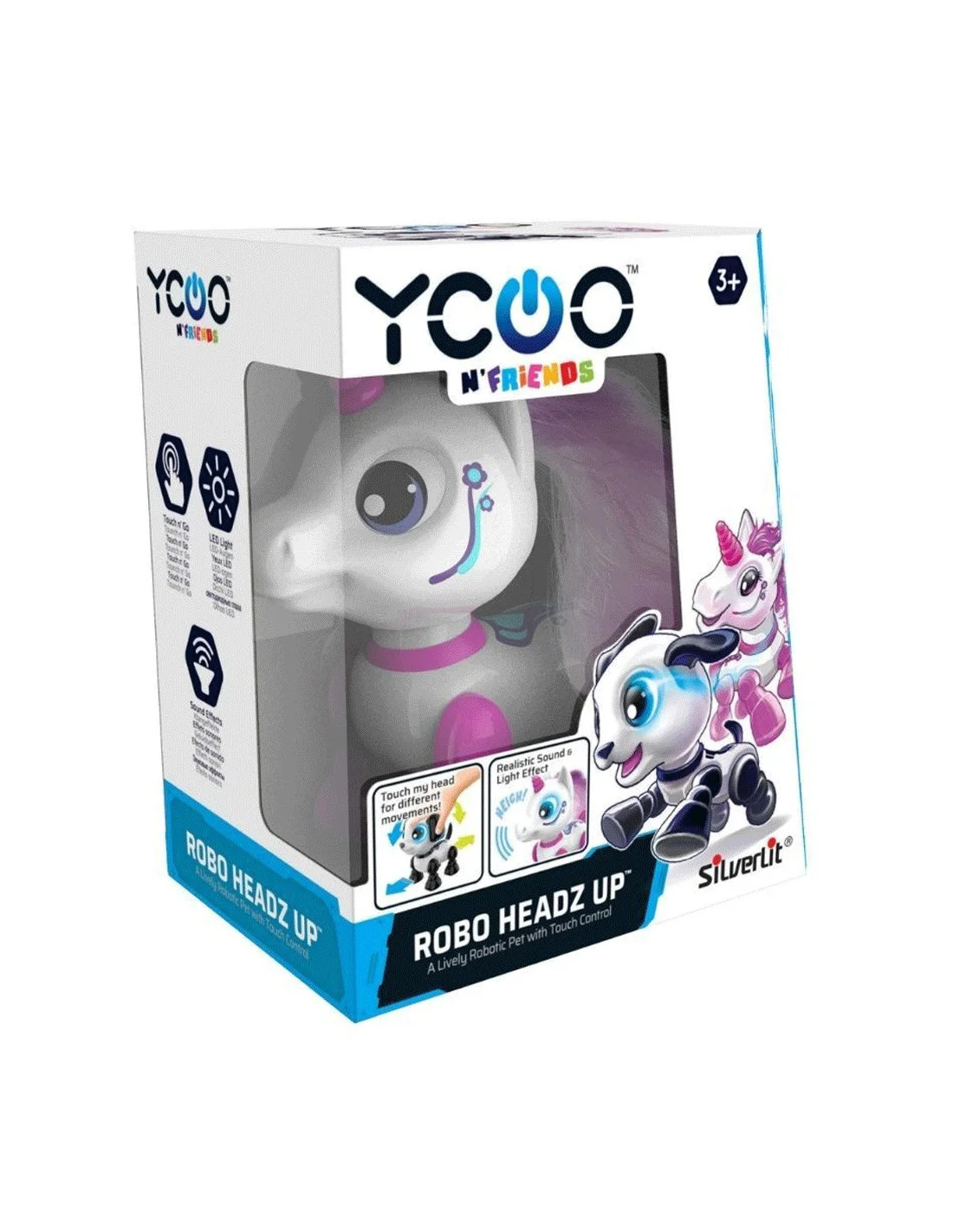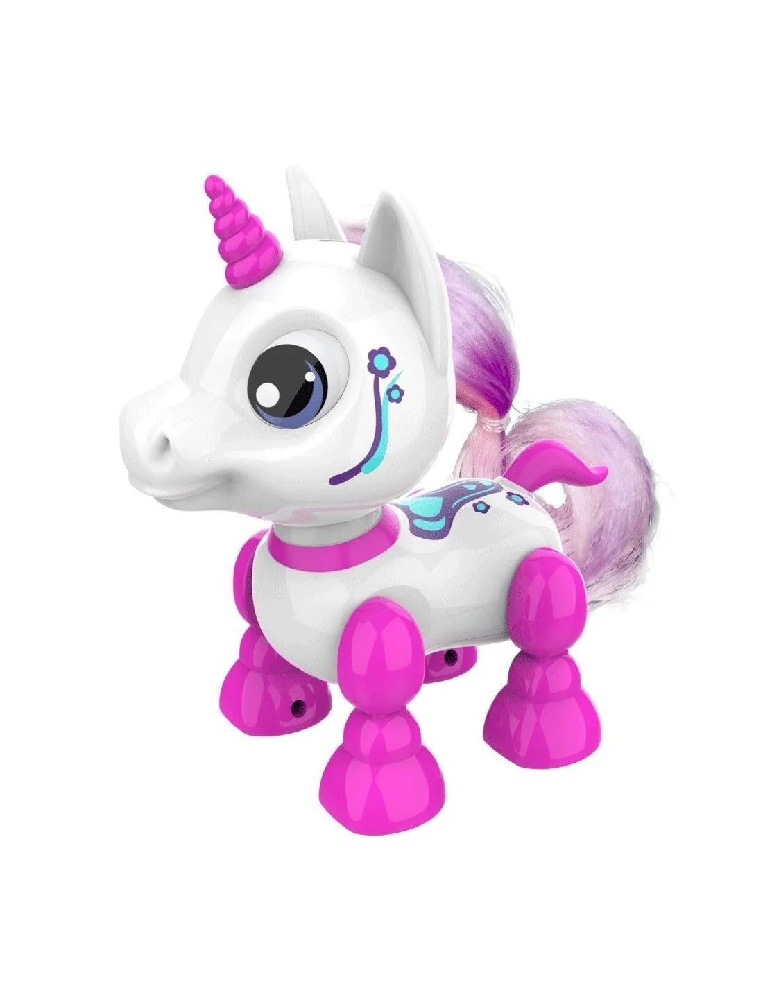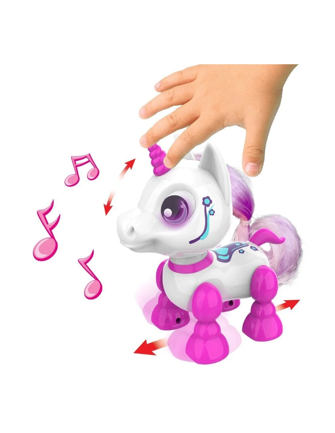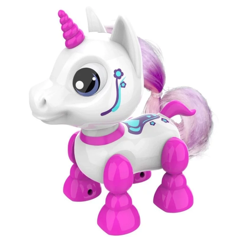 Robot licorne qui se déplace - 13 cm Ton robot licorne et sa superbe crinière se déplace quand tu lui touches la tête : appuie vers l'avant et il marchera ou appuie vers l'arrière pour le faire reculer. Ses yeux s'allument et il fait des petits bruits trop mignons. Piles : 2 x AAA (non incluses). Dès 3 ans.