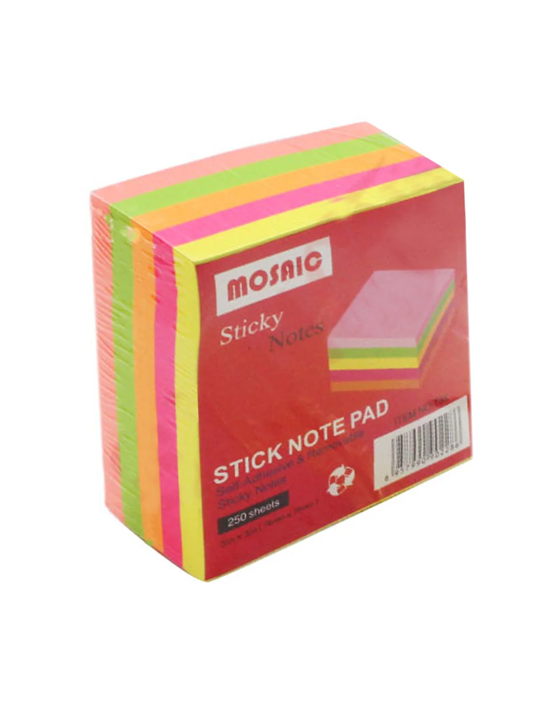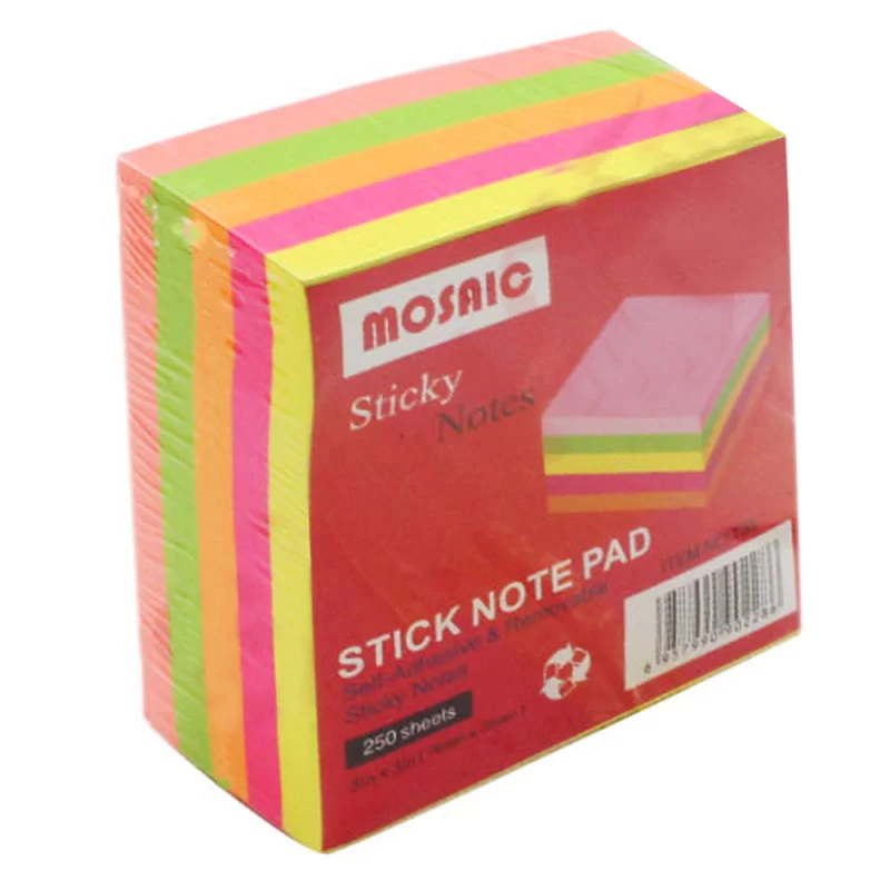 MOSAICBlocs de 250 feuilles de notes adhésives de 76 x 76 mm couleurs Fluo. Les notes sont fabriquées avec du papier certifié et adhésif à base d’eau. Elles sont idéales pour laisser un message sur tous types de surface. L’adhésif enlevable permet de les coller et les décoller plusieurs fois. La taille classique des notes par excellence.