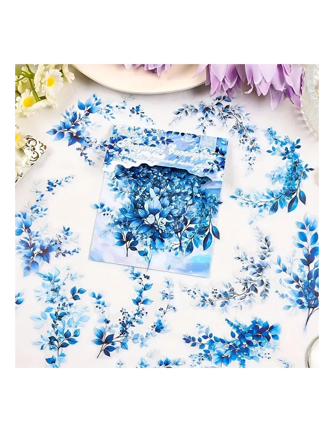 - "Fragrant Eucalyptus" propose une palette bleu profond et indigo élégante. Les branches d'eucalyptus aux feuilles arrondies créent des compositions sophistiquées et apaisantes.