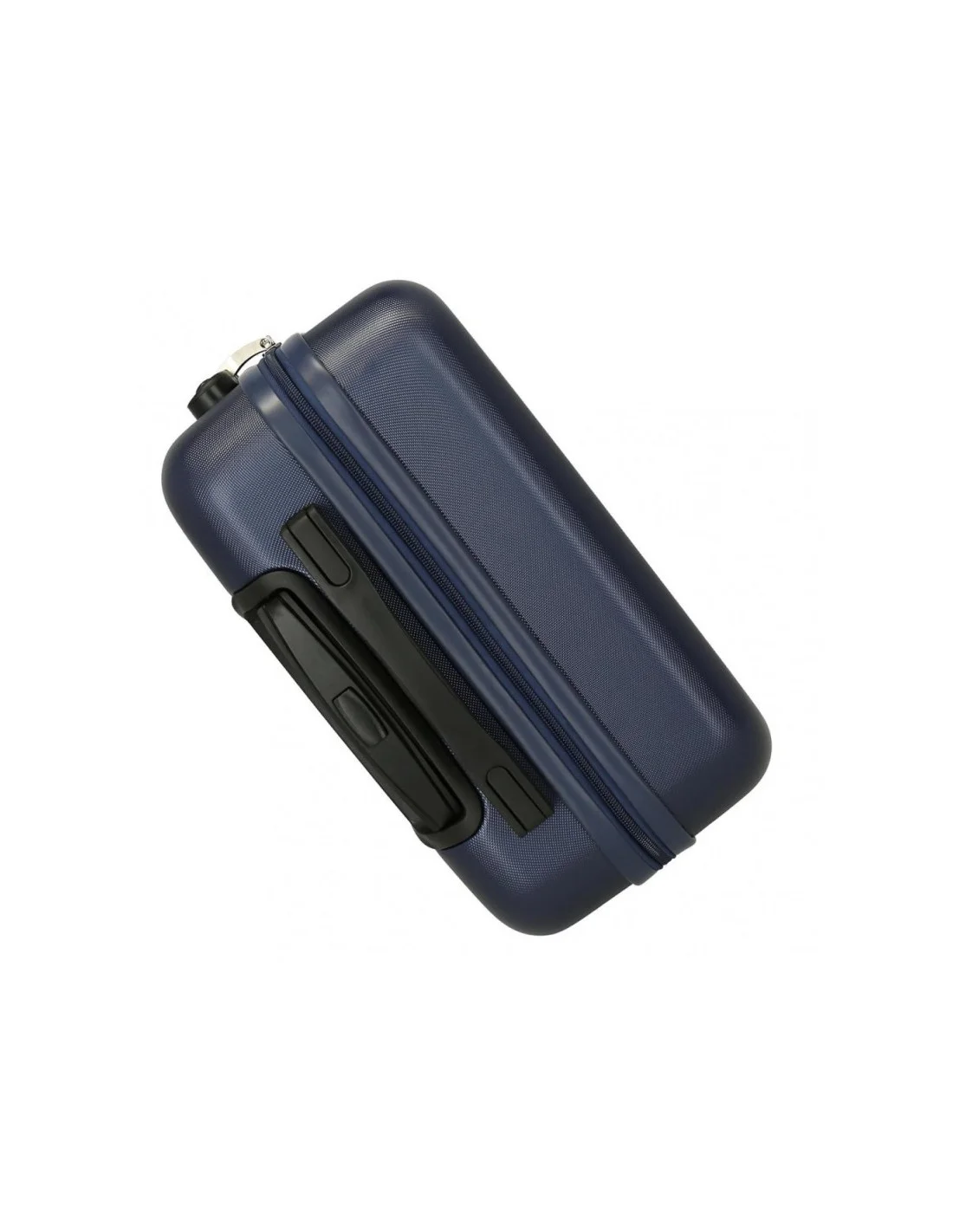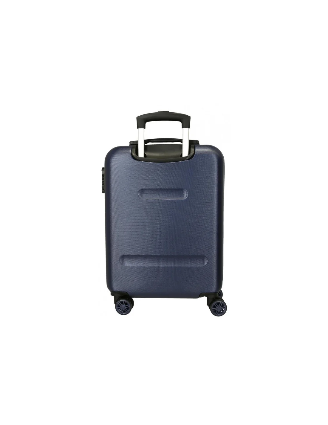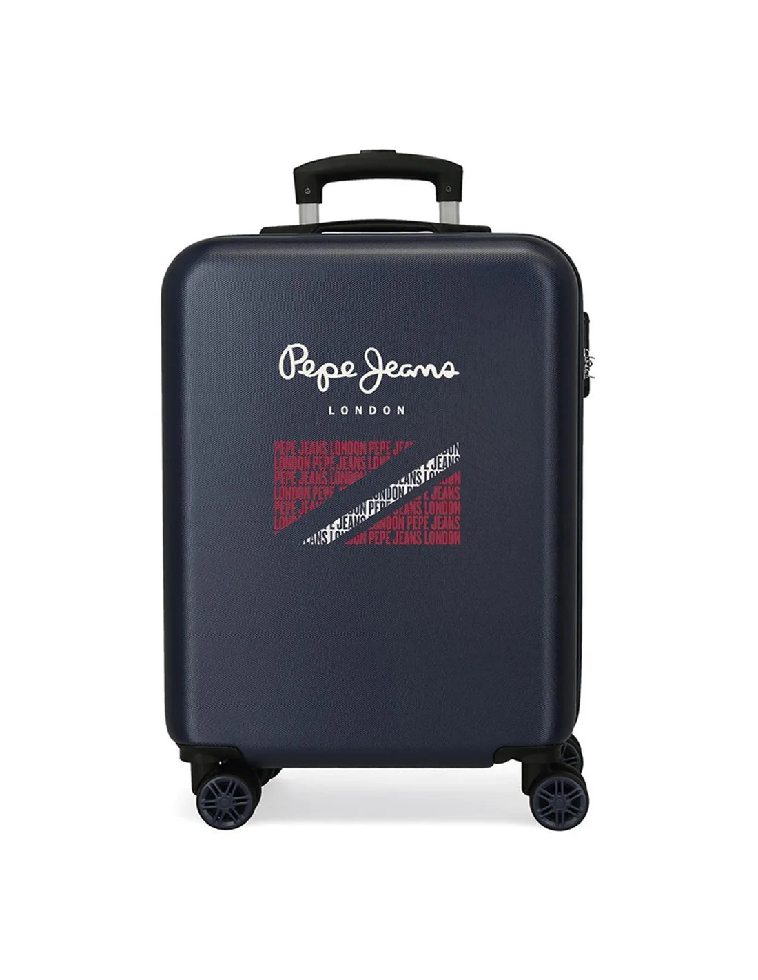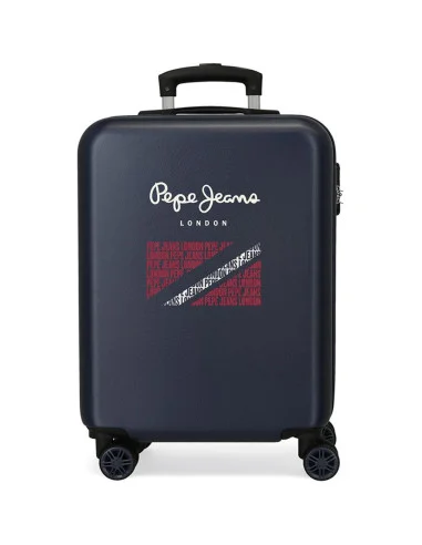Valise rigide Pepe Jeans Clark 65cm avec 4 roues multidirectionnelles. Coque ABS texturée bleu marine, design London avec drapeau britannique stylisé. Logo blanc élégant. Idéale pour voyages d'une semaine !