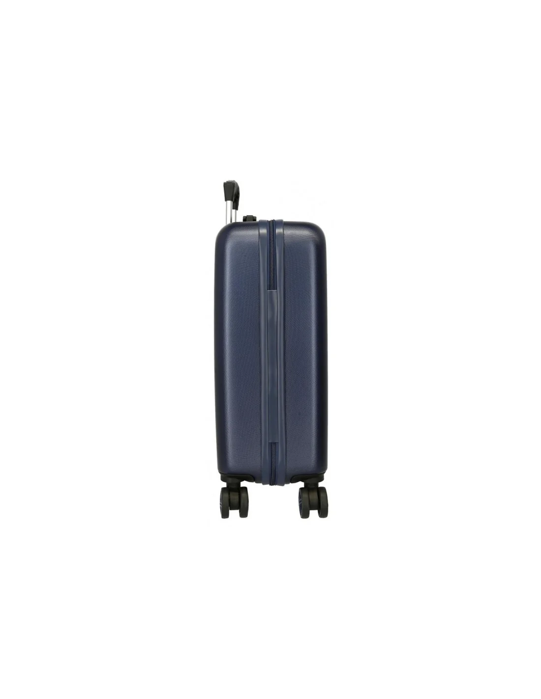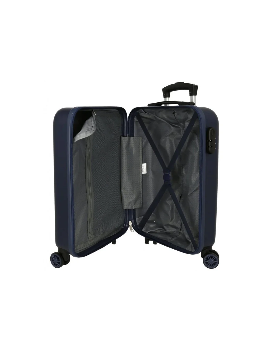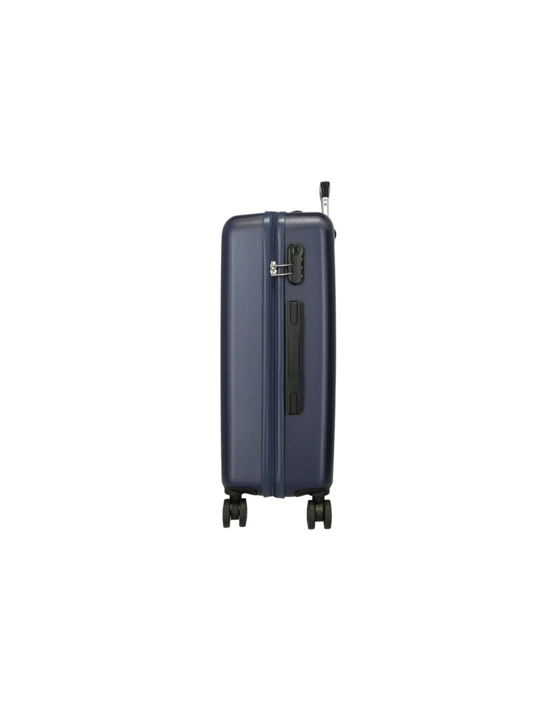 Valise rigide Pepe Jeans Clark 65cm avec 4 roues multidirectionnelles. Coque ABS texturée bleu marine, design London avec drapeau britannique stylisé. Logo blanc élégant. Idéale pour voyages d'une semaine !