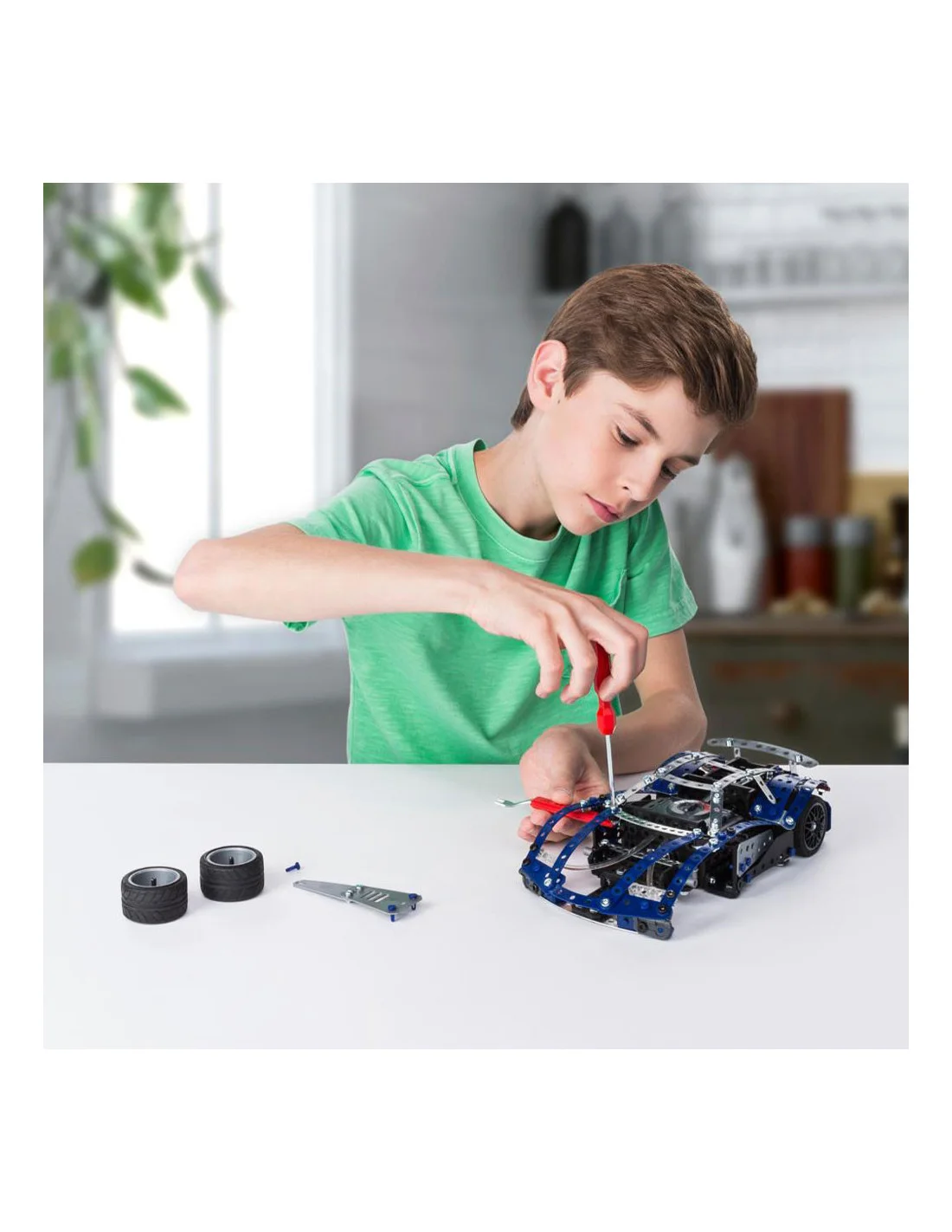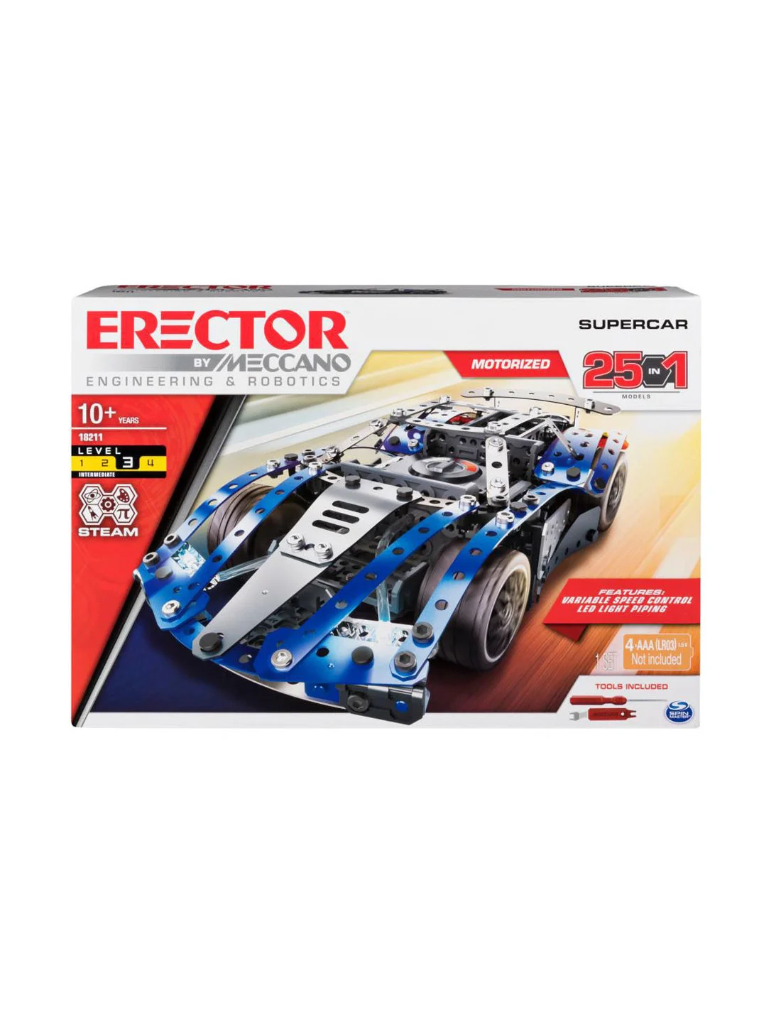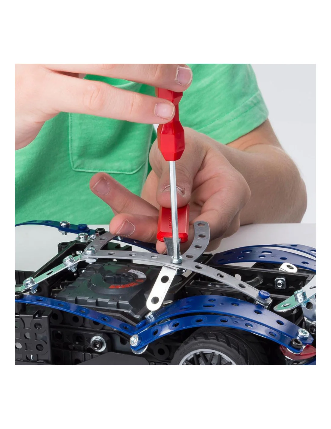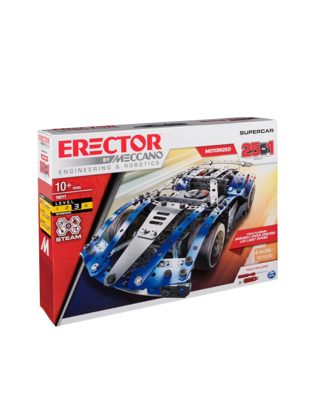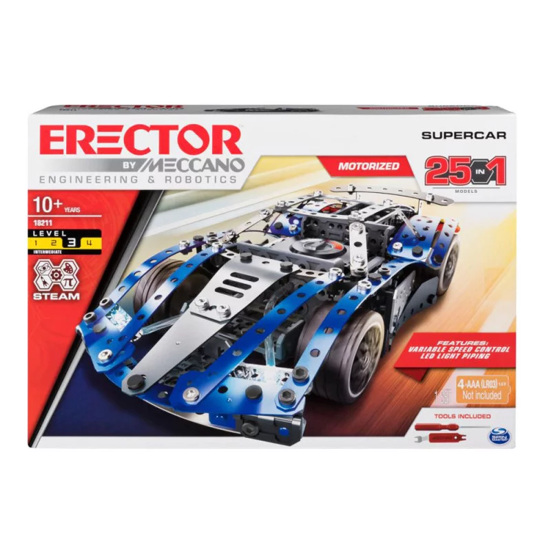 Construisez 25 modèles différents, dont une puissante SuperCar avec des lumières fonctionnelles, en utilisant des pièces métalliques Meccano et votre imagination.